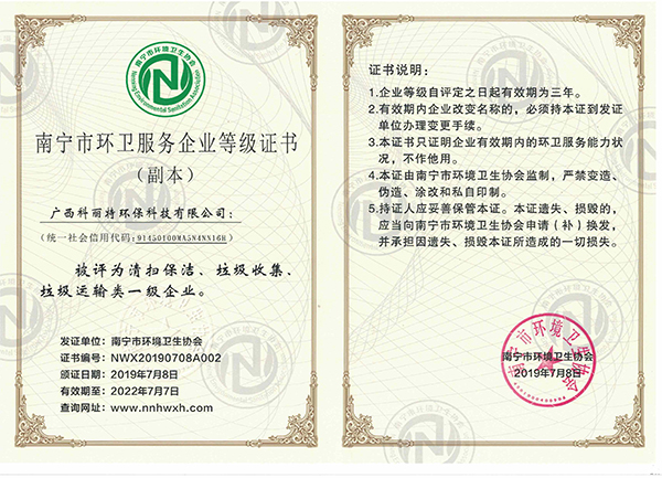 南寧市環(huán)衛(wèi)服務企業(yè)等級證書(一級)
